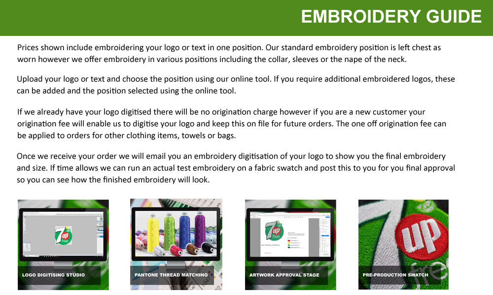 Our standard embroidery position is left chest as worn however we offer embroidery in various positions including the sleeves, collars & nape of the neck. Select your placement using the drop down box.
