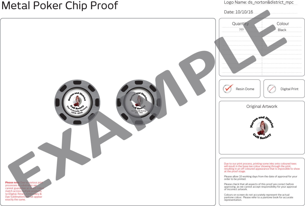 Metal poker chip with removable ball marker printed with your company logo, golf club or society crest.