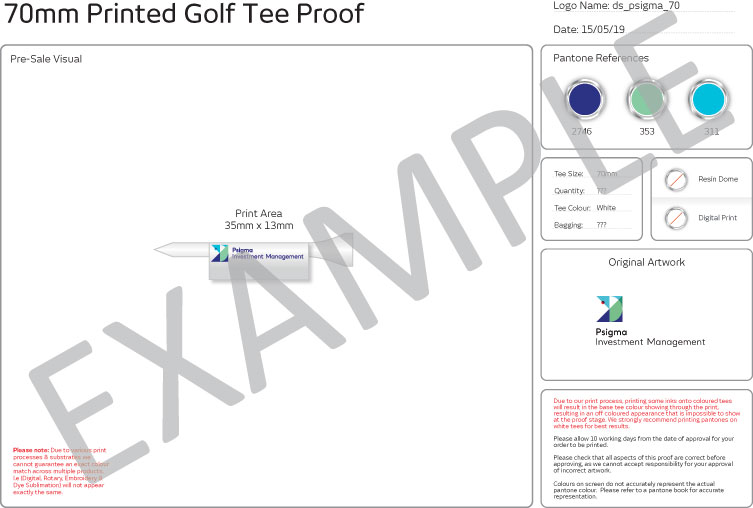 Premium quality bamboo 70mm golf tees printed in up to 3 colours. Logo can be wrapped around the shank, full PMS matching, PDF proof with every order.