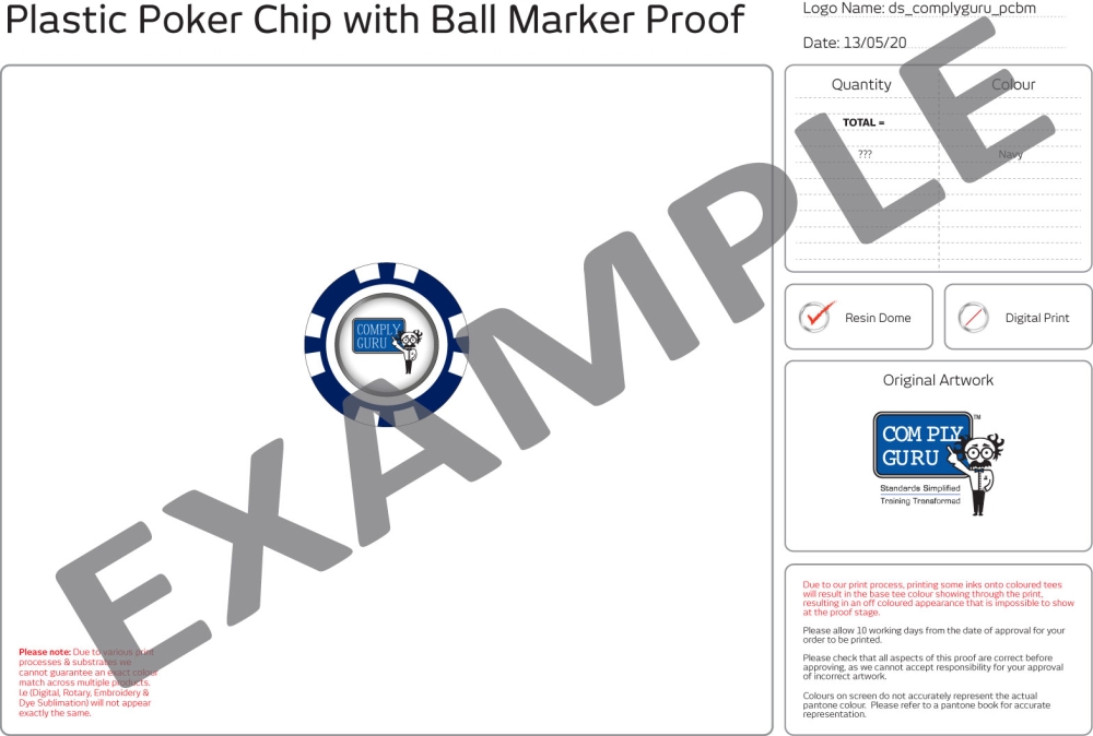 Plastic poker chip style ball marker with a removable magnetic ball marker printed with your company logo, golf club or society crest.